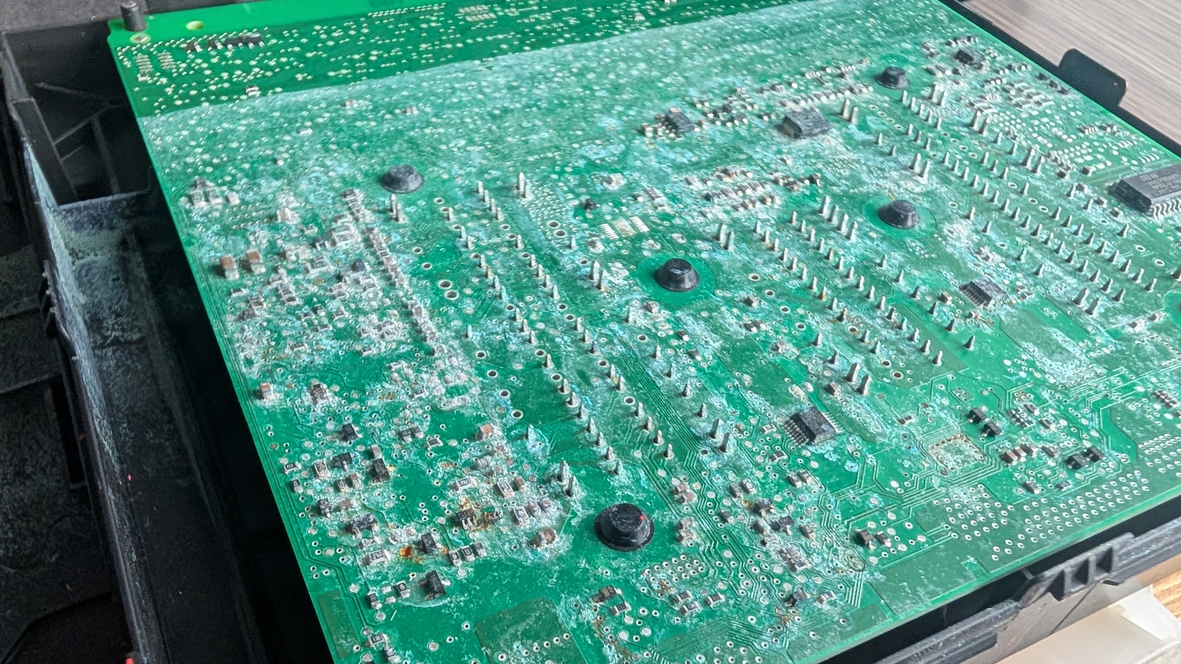 Piilusin BCMi sisse, mida ei õnnestunud tööle saada. Oh üllatust, tundub küll sedamoodi uppunud masinalt pärit. Õnneks sain kauba eest raha tagasi ja võib minema visata. Trükkplaadil on ideaalne joon näha kus vesi on olnud ja korralikult oksiidine.