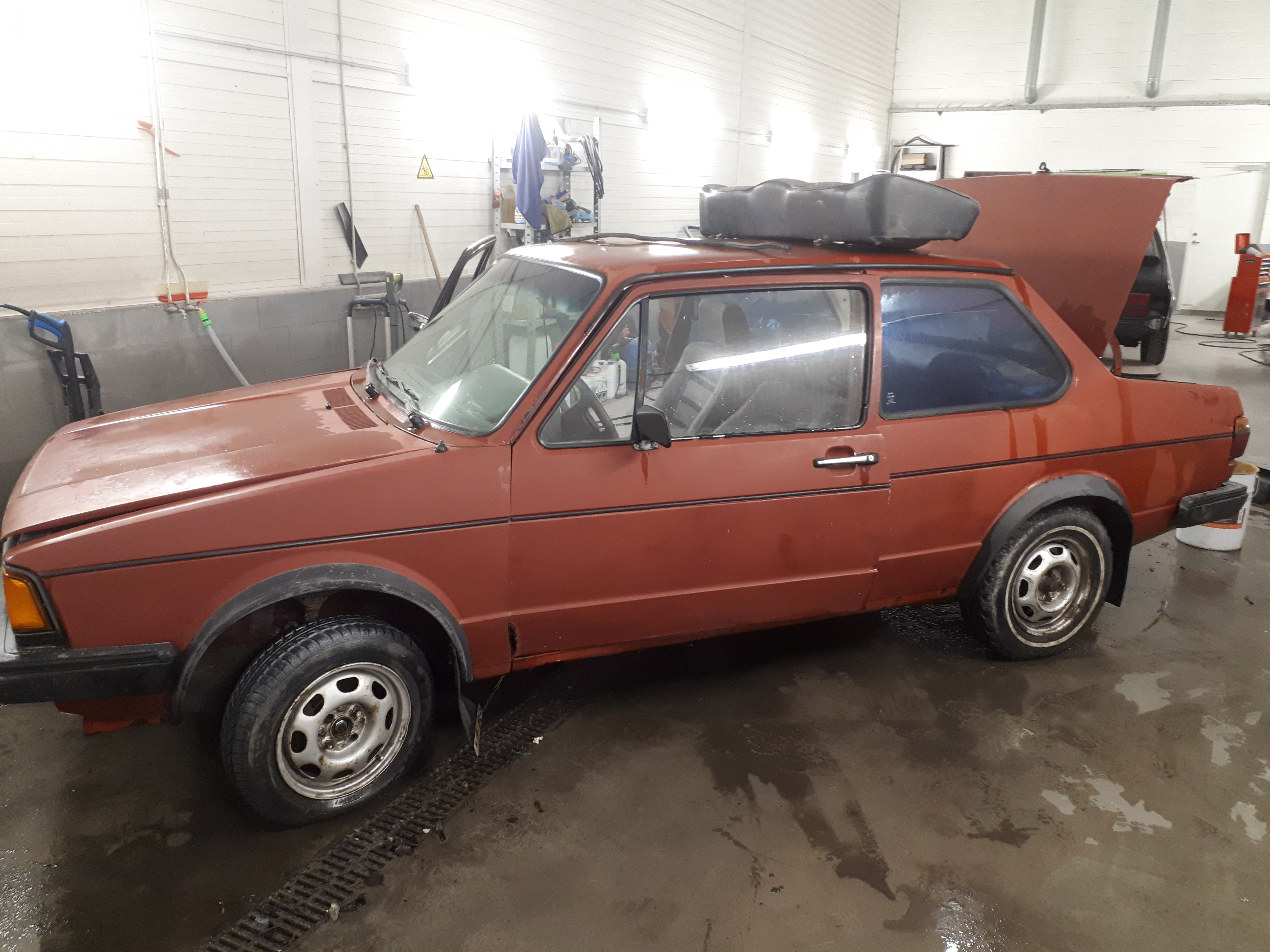 Imelikul kombel, maeiteamiks, sattus mulle üks vana jetta. Kas just seda nüüd vaja oli, ei tea. Tõmbas selle poole just see, et 2 ukseline. Läksin vaatama, üsna kindel olles, et tühjade kätega ma tagasi ei tule, kuna see vanade autode haigus lööb ikka veel vahepeal välja. Istus seal nukralt lume all, külm oli kah, isegi seest oli härmas. Vaatasin siit ja sealt ja ikka need tüüpkohad nagu ikka, aukus. Kuigi peab tunnistama, et minuarust täitsa hea eksemplar. Natuke parem kui roheline golf oli, kuid samas ikka palju parem kui kollane on. Leppisime kokku ja järgmine päev sai treilaga ära toodud. Pagassi lahti ei saanud, kuna lukk oli arvatavasti jääs. Samas hiljem selgus et lukk katki. Sai siis katkise tule august käsi sisse aetud ja lahti tehtud. Oh sa! Põhjamatt olemas ja täiesti terve. Armaturi alumine pool ka olemas. Uued esi kettad ja klotsid ka pagassis ja muud prügi ka. Hiired olid seal omajagu tralli teinud, õkk.