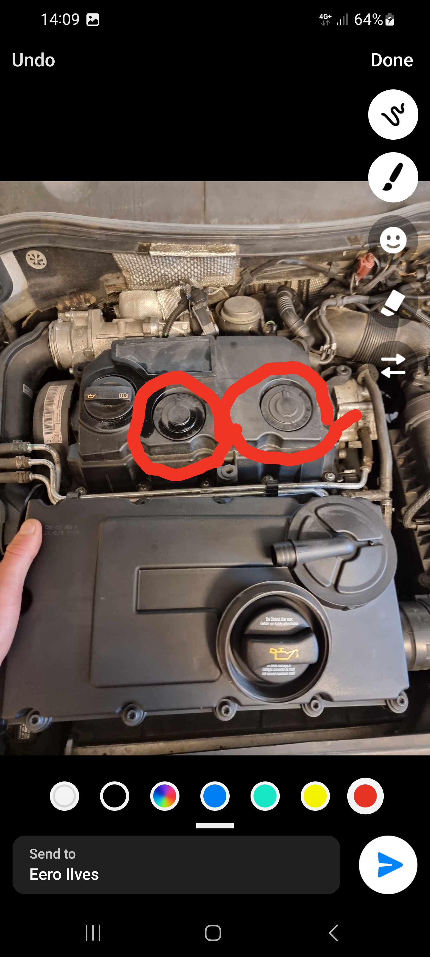 Pildilt küll aru ei saa,kus karteri tuulutus on. Saan aru,kui näen näppude vahel olevat plastik plokikaane mütsi. Seal on ju karteri tuulutus otsik . Nüüd pildil ringiga märgitud probleemne koht. Jummal hoitku. Liiguta näppe,ja siis küsi edasi. Keera need plastikud maha.
